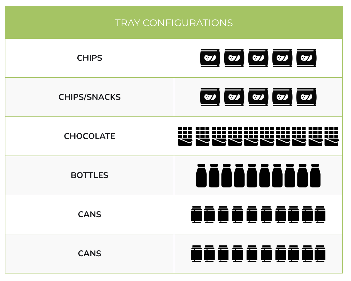 Trays are fully configurable and can hold a mix of snacks, chocolates, pastries, cans, and bottles.